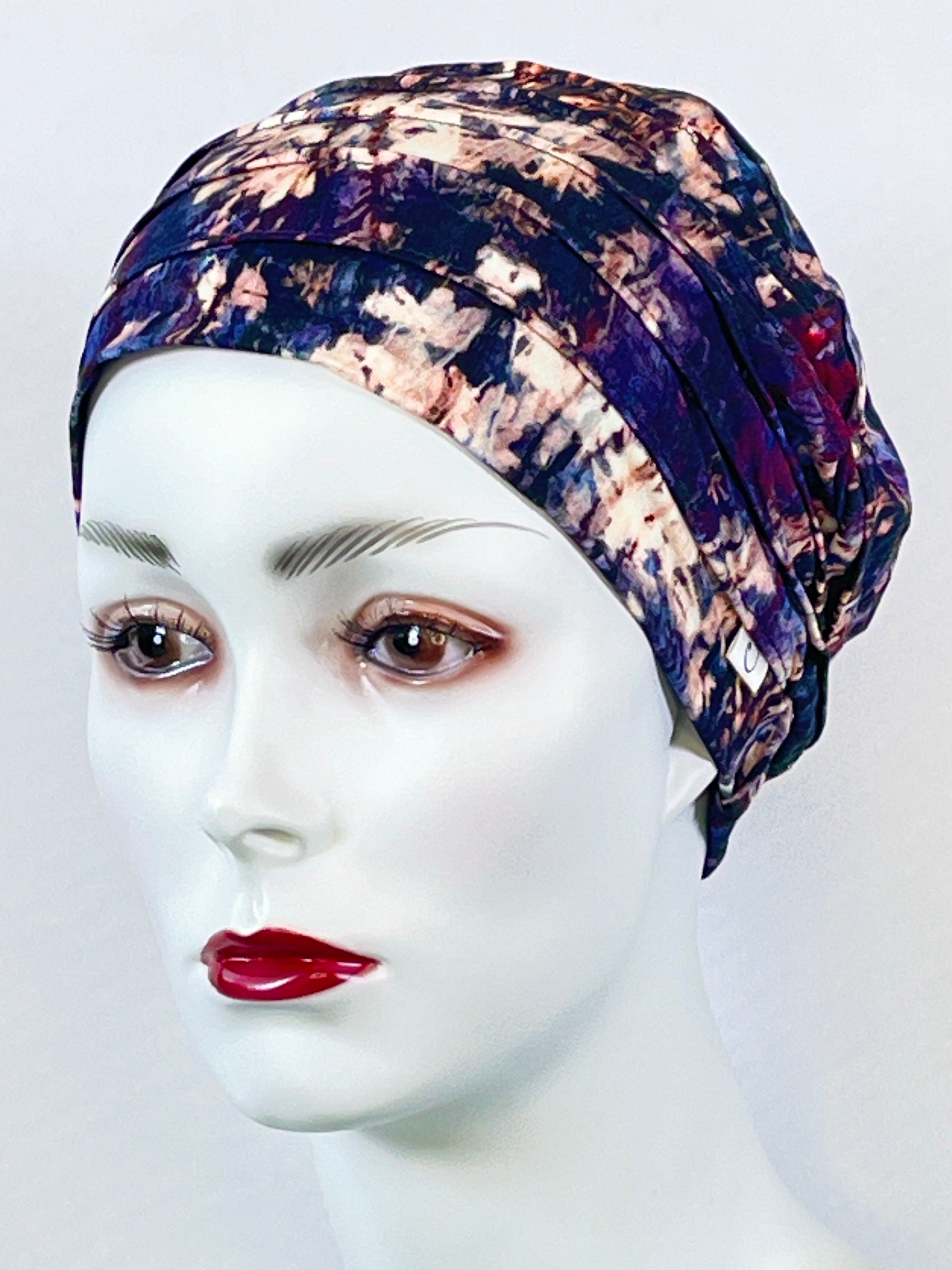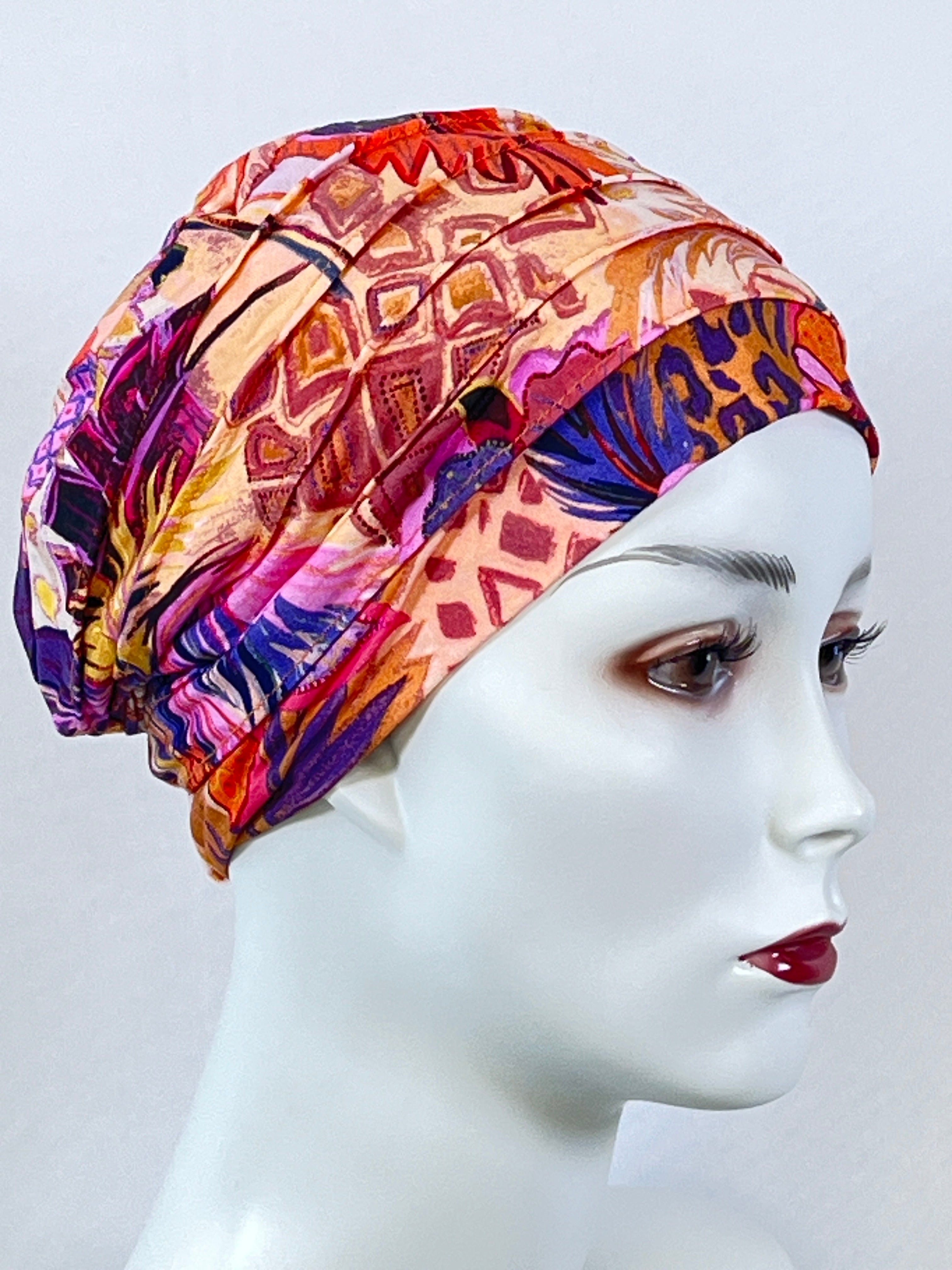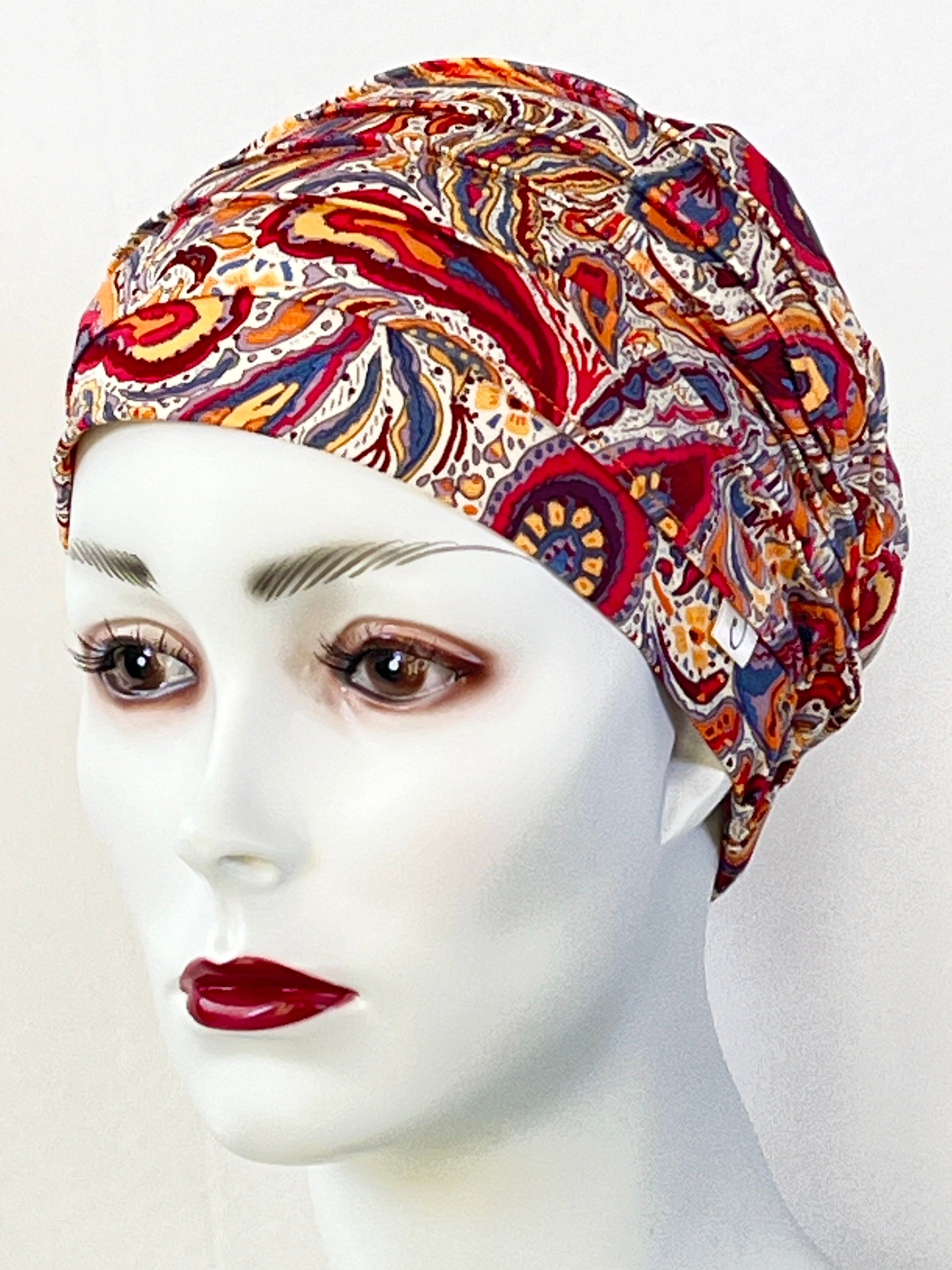 Wunderschöne Mützen auf bedruckten Stoff als Alternative zu einer Perücke. Diese farbenfrohe Kopfbedeckung kann nach ihrer Genesung auch über dem Haar getragen werden. Das Material bestehend aus Bambus / Viskose mit Elastan ist dabei ein umweltfreundliches Produkt. Durch das Caretech Qualitätssiegel wirkt das puristische Mützchen temperaturregulierend für ihre sensible Kopfhaut. Viele ausgefallene frische Farben erfüllen vielseitige Kundenwünsche.