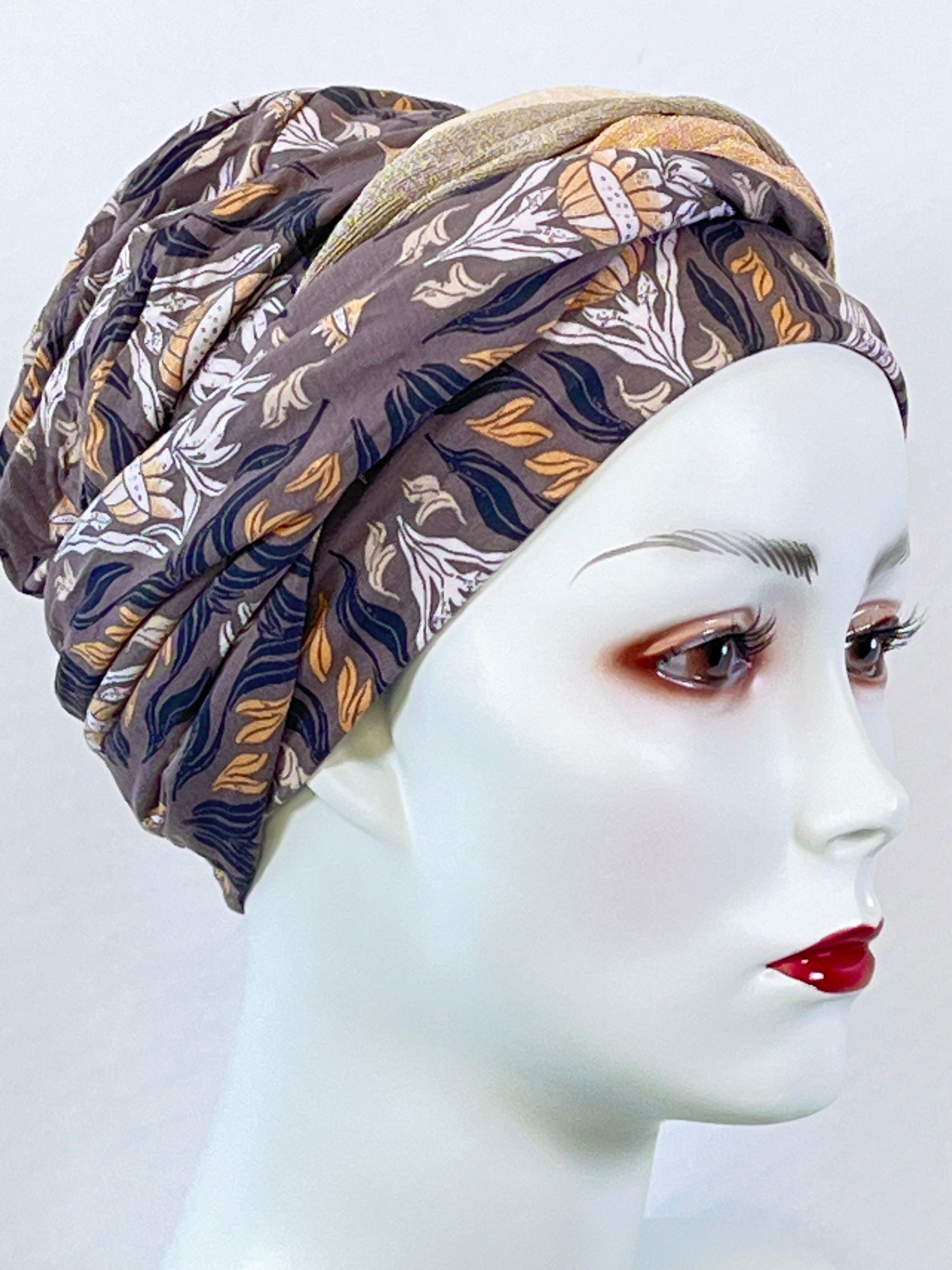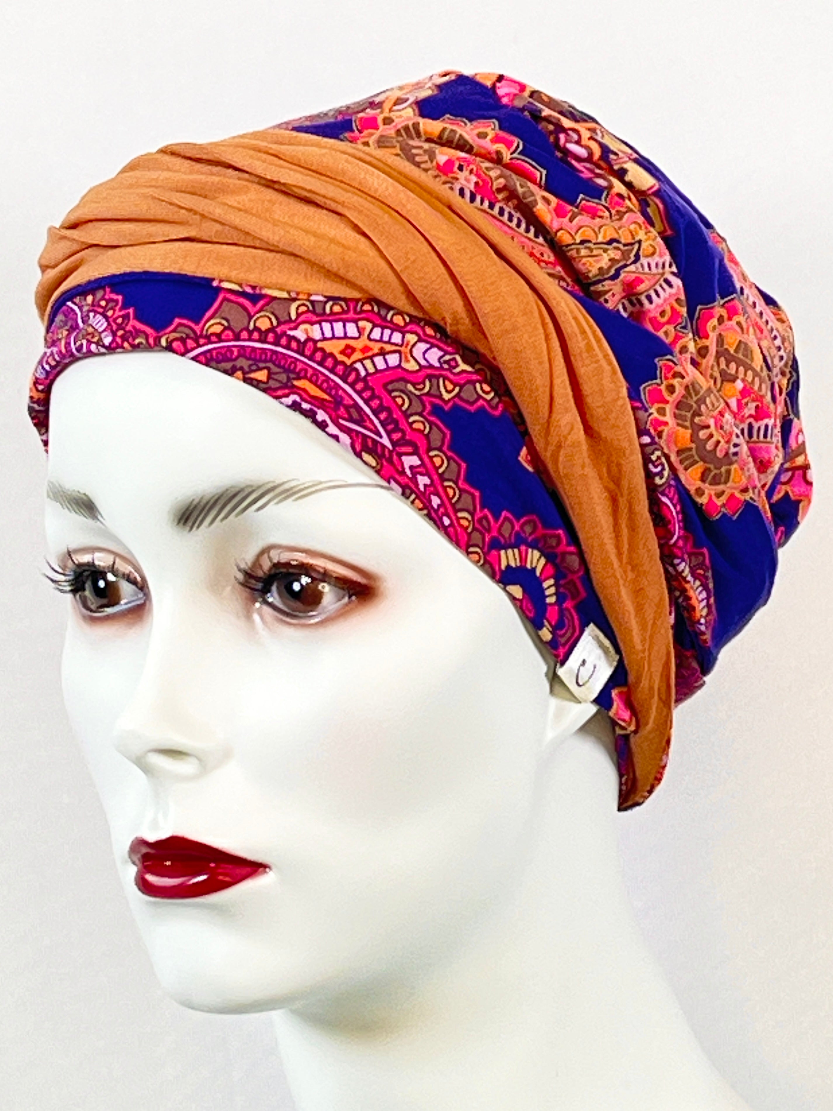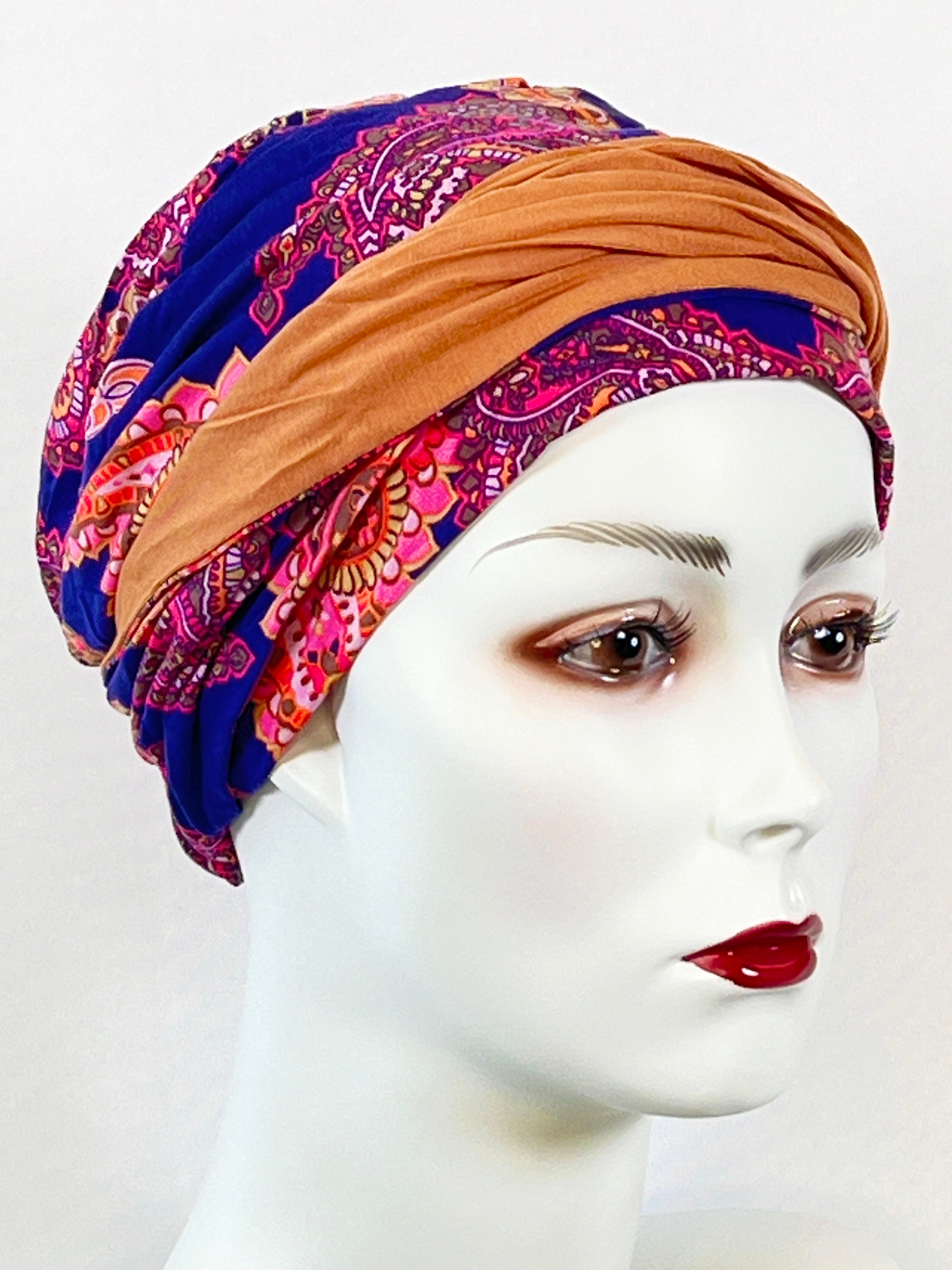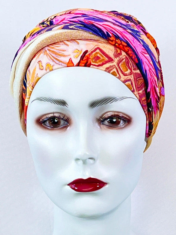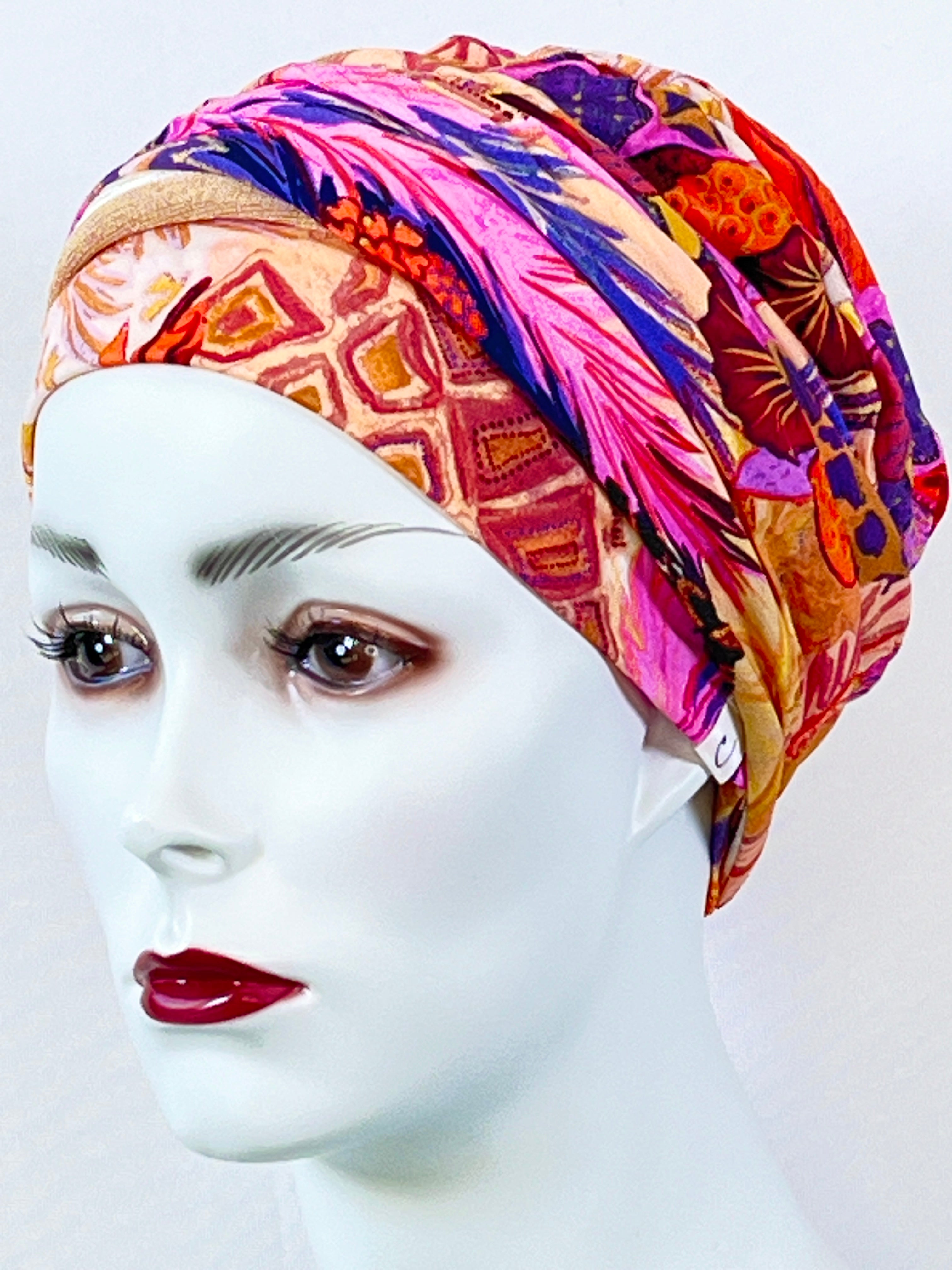 Wellness-Mütze mit betonter Stirnpartie durch ein integriertes Stirnband. Diese Turban ähnliche Kopfbedeckung ist leicht in der Handhabung bei Haarverlust. Aufsetzen, Stirnband zurecht zupfen, fertig. Das Material bestehend aus Bambus / Viskose & Caretech Qualitätssiegel hält ihre sensible Haut warm, aber auch kühl und feuchtigkeitsabsorbierend. Das bedruckte Stirnband aus stilvollem Dekorstoff gibt ihrem Kopf mehr Raum. Dabei ist es ein umweltfreundliches Produkt.