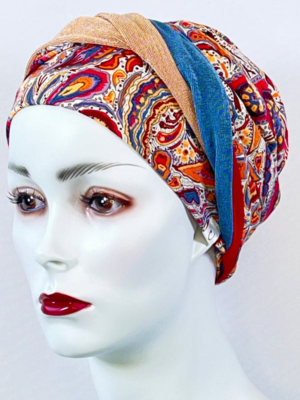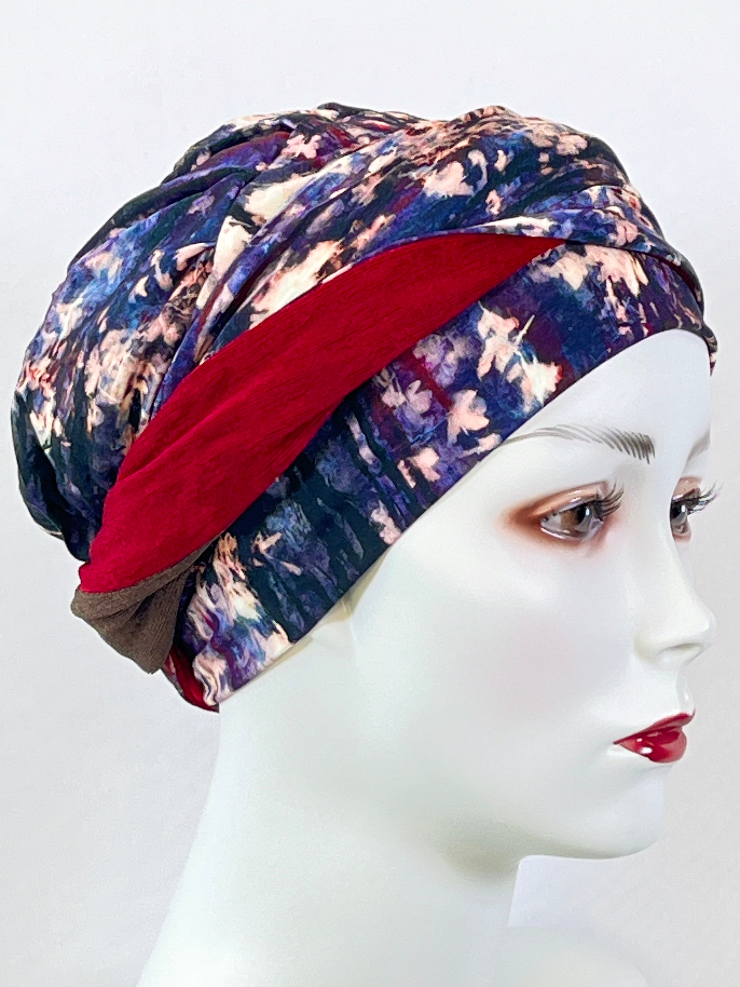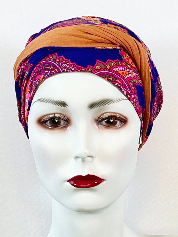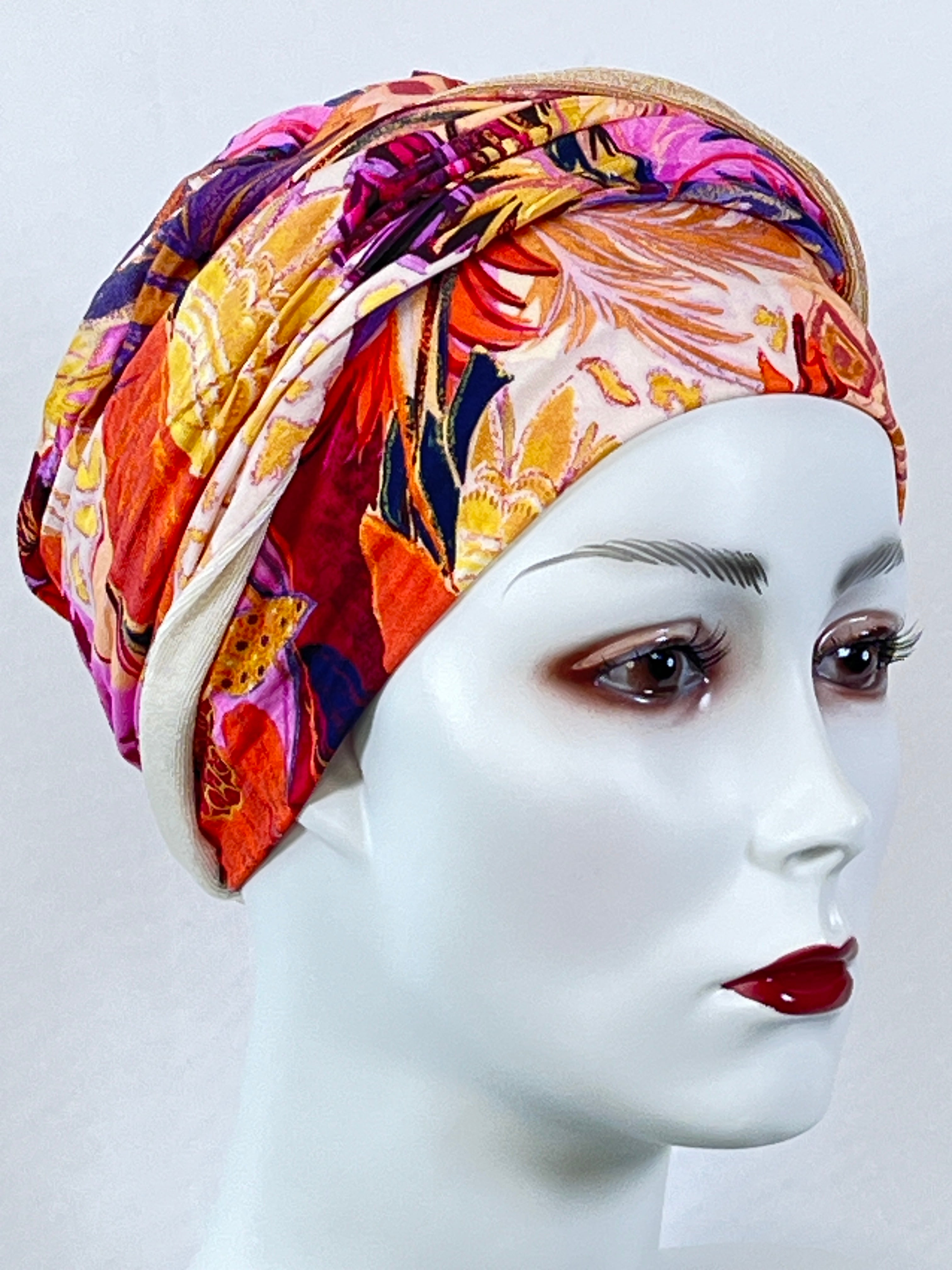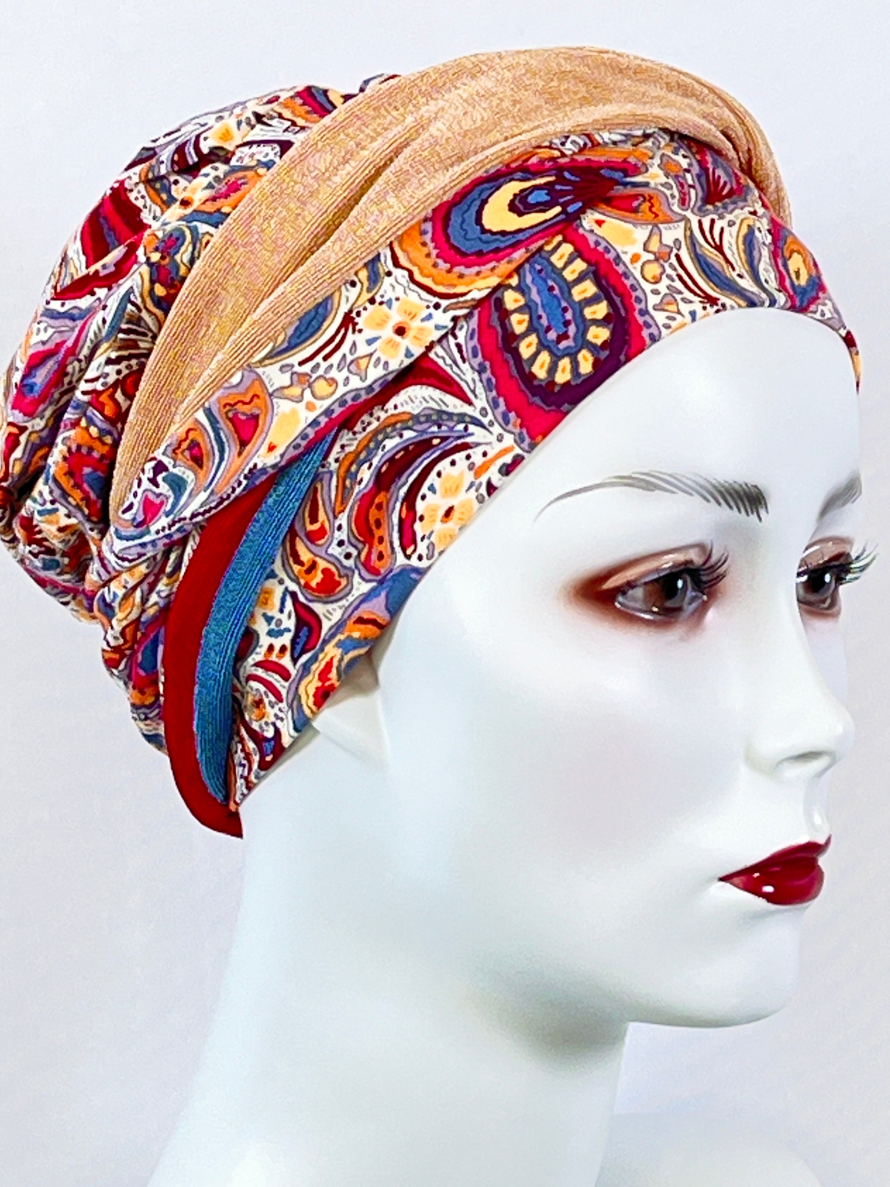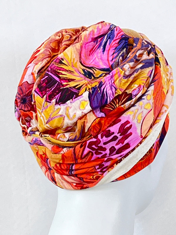 Wellness-Mütze mit betonter Stirnpartie durch ein integriertes Stirnband. Diese Turban ähnliche Kopfbedeckung ist leicht in der Handhabung bei Haarverlust. Aufsetzen, Stirnband zurecht zupfen, fertig. Das Material bestehend aus Bambus / Viskose & Caretech Qualitätssiegel hält ihre sensible Haut warm, aber auch kühl und feuchtigkeitsabsorbierend. Das bedruckte Stirnband aus stilvollem Dekorstoff gibt ihrem Kopf mehr Raum. Dabei ist es ein umweltfreundliches Produkt.