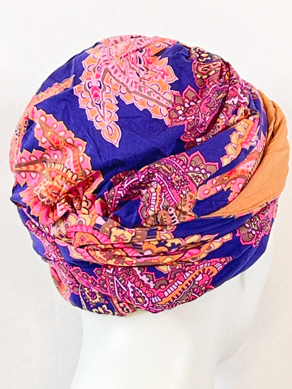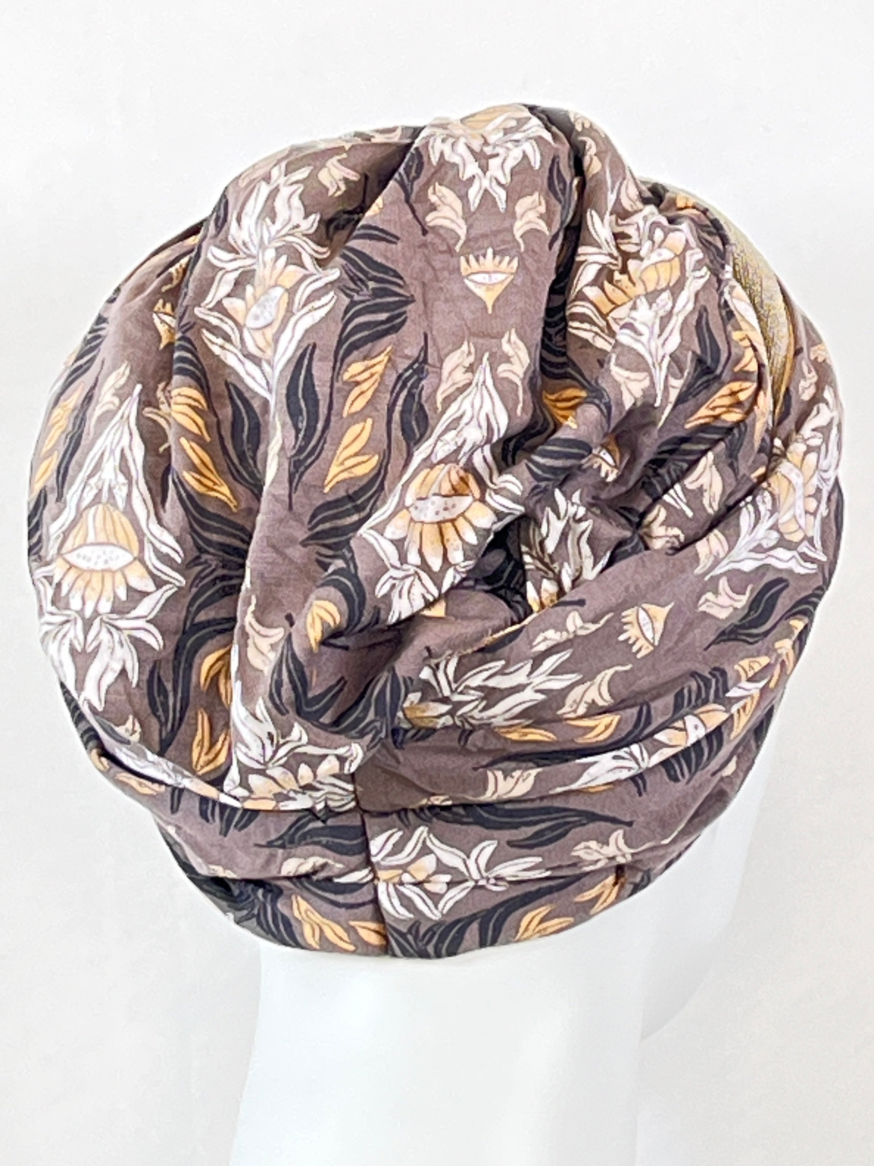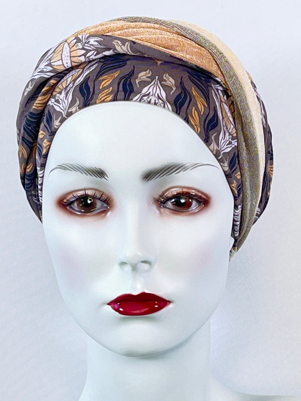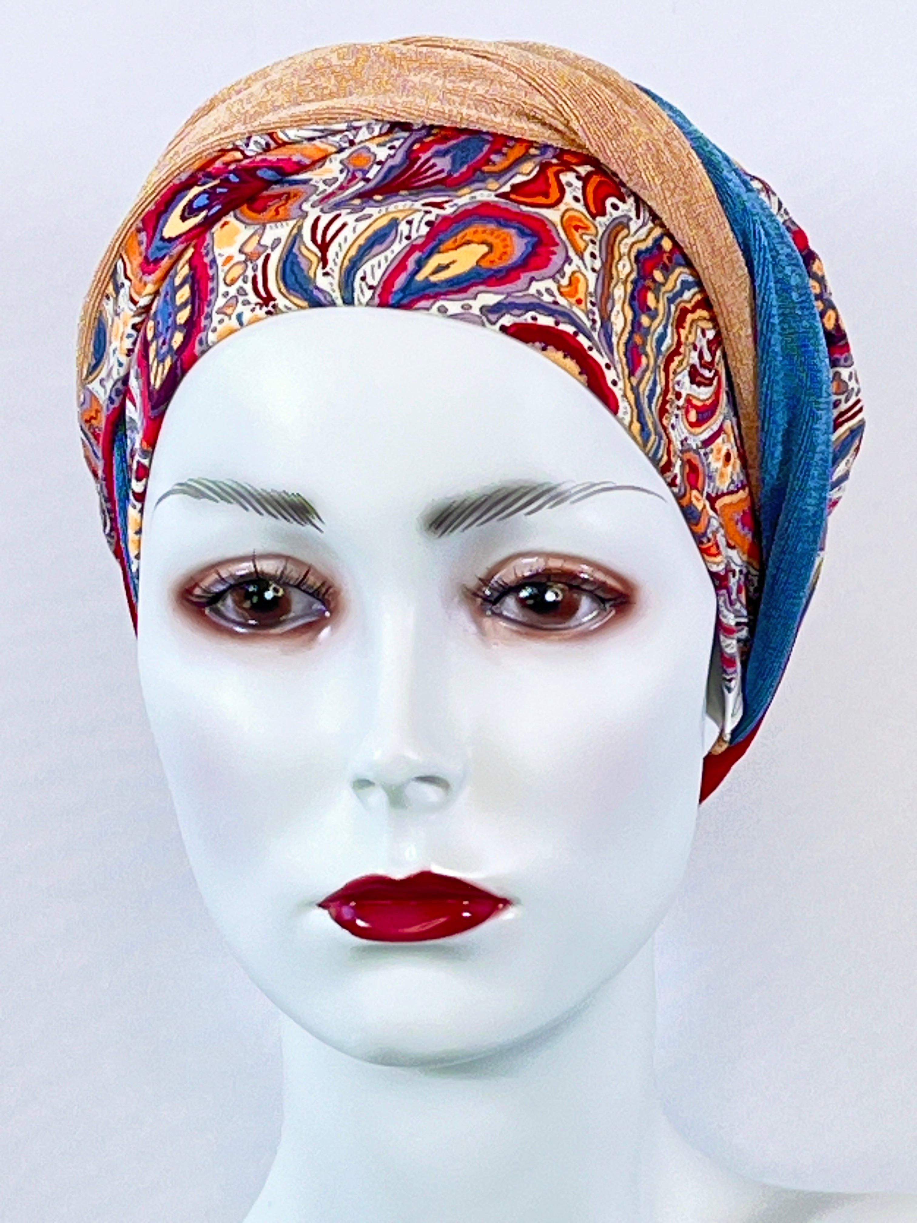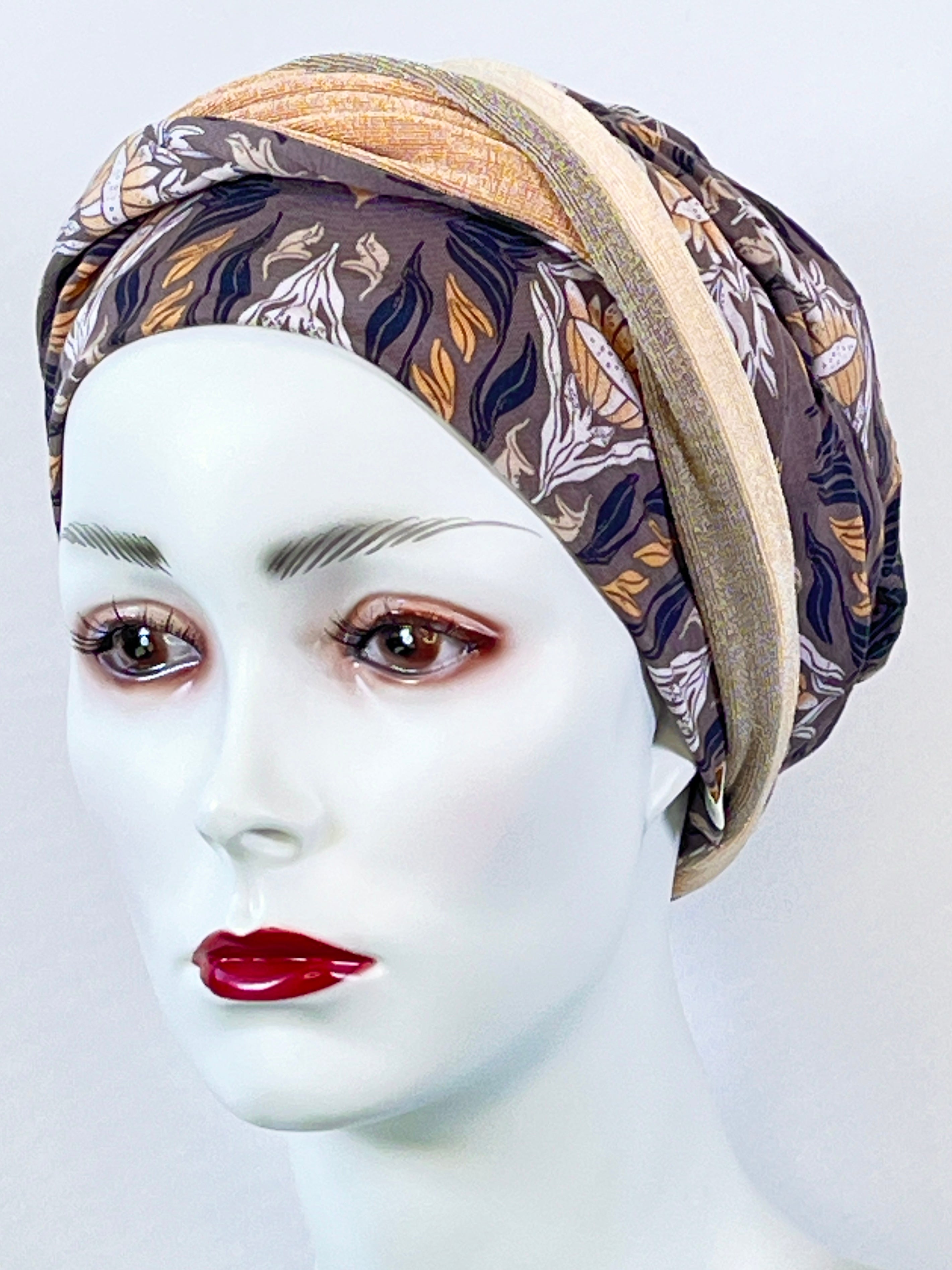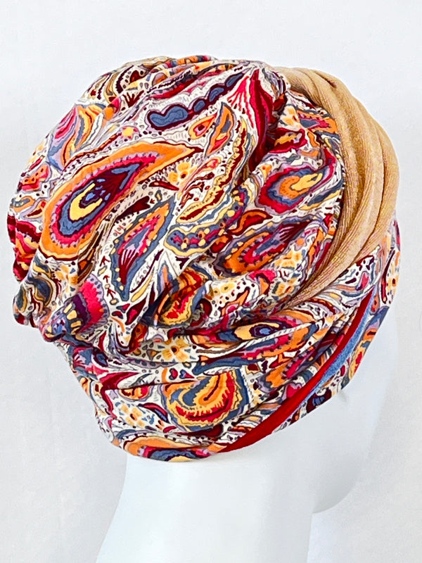 Wellness-Mütze mit betonter Stirnpartie durch ein integriertes Stirnband. Diese Turban ähnliche Kopfbedeckung ist leicht in der Handhabung bei Haarverlust. Aufsetzen, Stirnband zurecht zupfen, fertig. Das Material bestehend aus Bambus / Viskose & Caretech Qualitätssiegel hält ihre sensible Haut warm, aber auch kühl und feuchtigkeitsabsorbierend. Das bedruckte Stirnband aus stilvollem Dekorstoff gibt ihrem Kopf mehr Raum. Dabei ist es ein umweltfreundliches Produkt.
